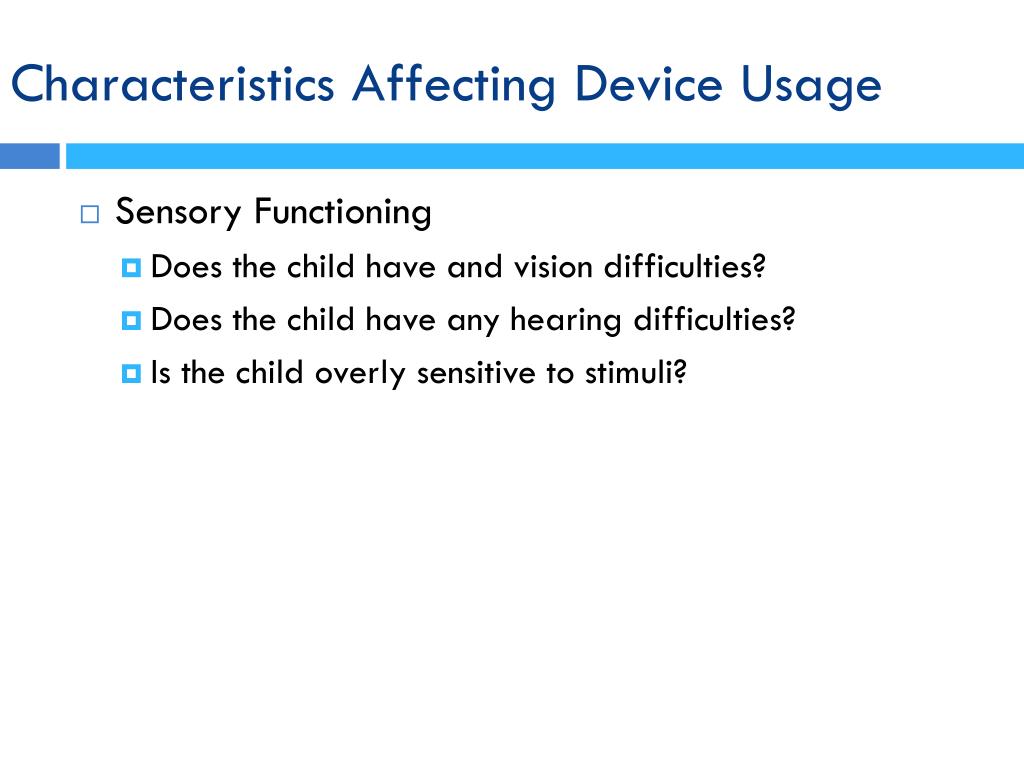 Characteristics Affecting Device Usage • Sensory Functioning • Does the child have and vision difficulties? • Does the child have any hearing difficulties? • Is the child overly sensitive to stimuli?