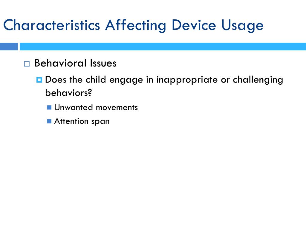 Characteristics Affecting Device Usage • Behavioral Issues • Does the child engage in inappropriate or challenging behaviors? • Unwanted movements • Attention span