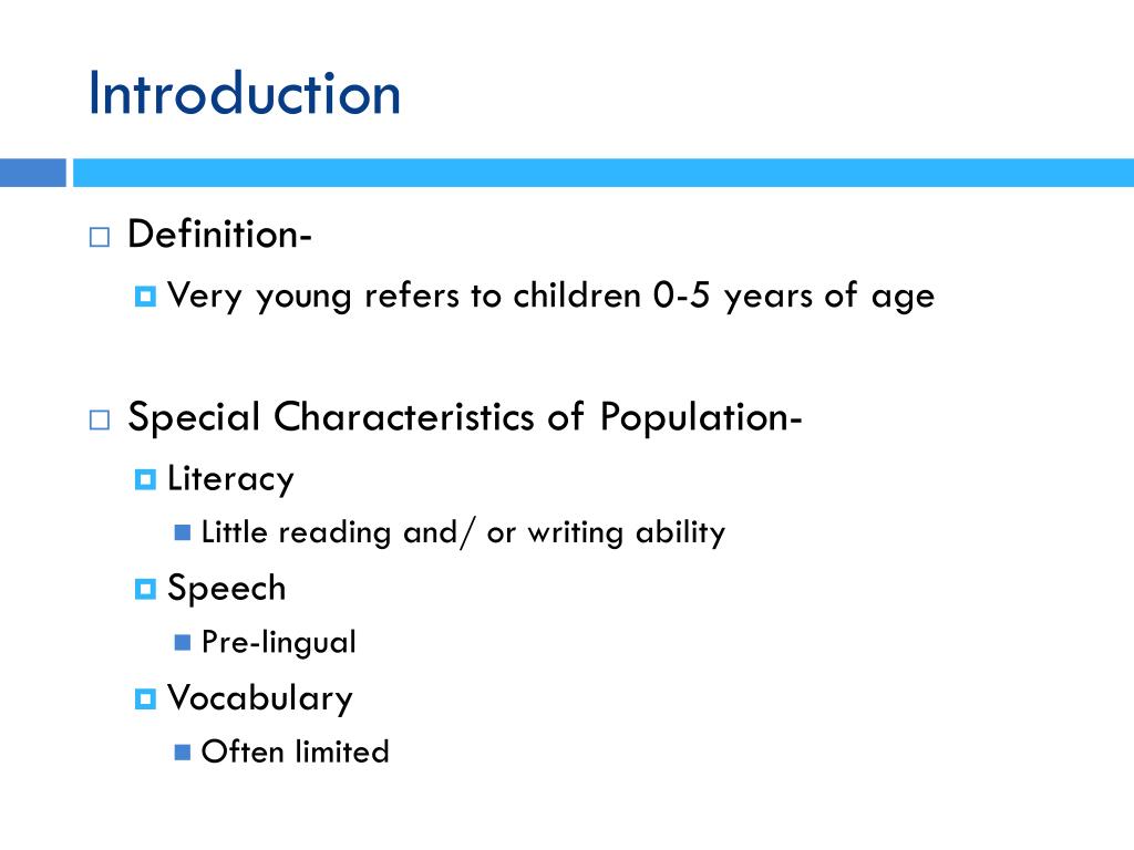 Introduction • Definition- • Very young refers to children 0-5 years of age • Special Characteristics of Population- • Literacy • Little reading and/ or writing ability • Speech • Pre-lingual • Vocabulary • Often limited