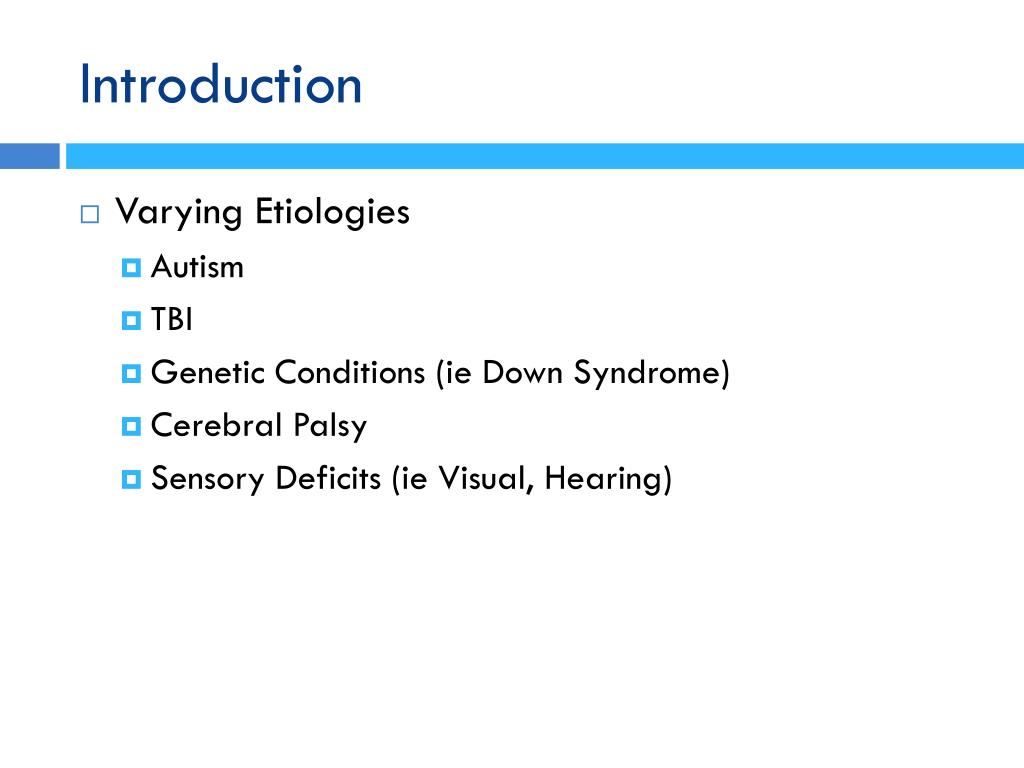 Introduction • Varying Etiologies • Autism • TBI • Genetic Conditions (ieDown Syndrome) • Cerebral Palsy • Sensory Deficits (ie Visual, Hearing)