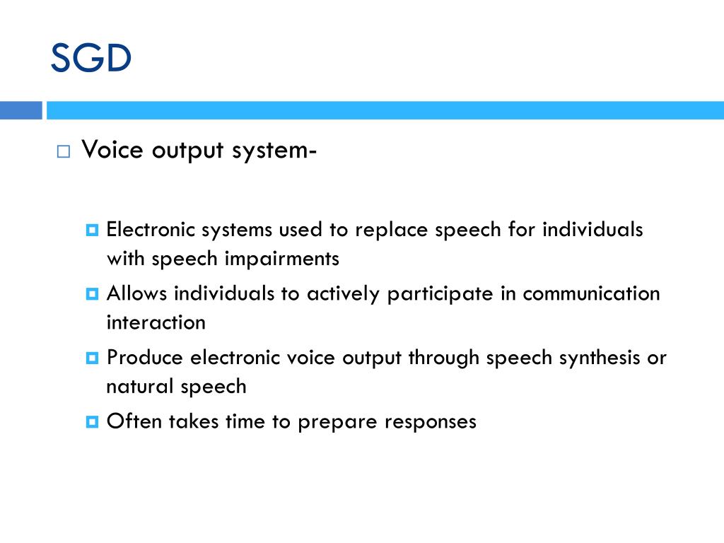 SGD • Voice output system- • Electronic systems used to replace speech for individuals with speech impairments • Allows individuals to actively participate in communication interaction • Produce electronic voice output through speech synthesis or natural speech • Often takes time to prepare responses