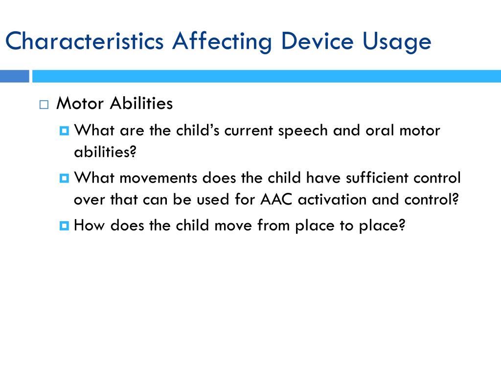 Characteristics Affecting Device Usage • Motor Abilities • What are the child’s current speech and oral motor abilities? • What movements does the child have sufficient control over that can be used for AAC activation and control? • How does the child move from place to place?