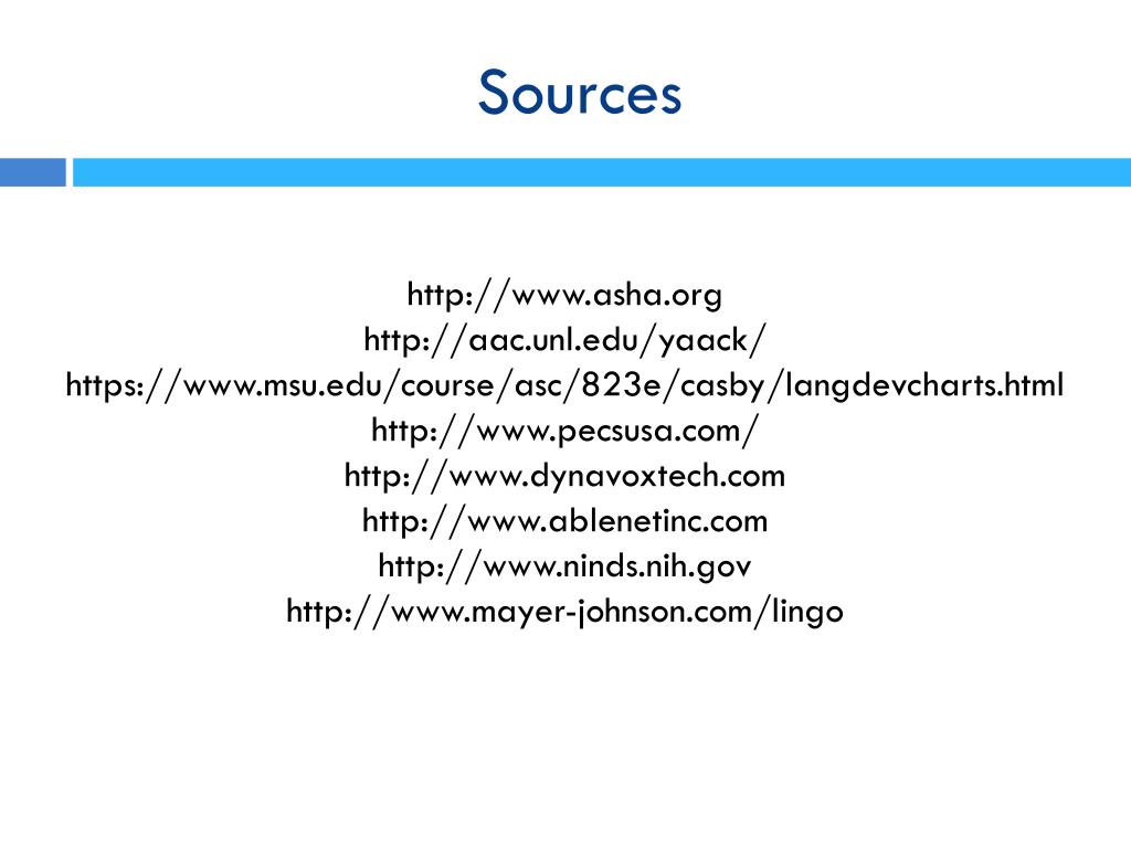 Sources http://www.asha.org http://aac.unl.edu/yaack/ https://www.msu.edu/course/asc/823e/casby/langdevcharts.html http://www.pecsusa.com/ http://www.dynavoxtech.com http://www.ablenetinc.com http://www.ninds.nih.gov http://www.mayer-johnson.com/lingo