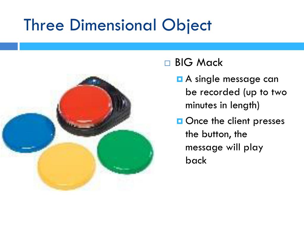 Three Dimensional Object- BIG mack PROS CONS • Ideal for communication for individuals that need a larger target area • Low tech, so easy to program and use • Can hook up to other devices • Only has one recorded phrase at a time • Costly • Not very durable