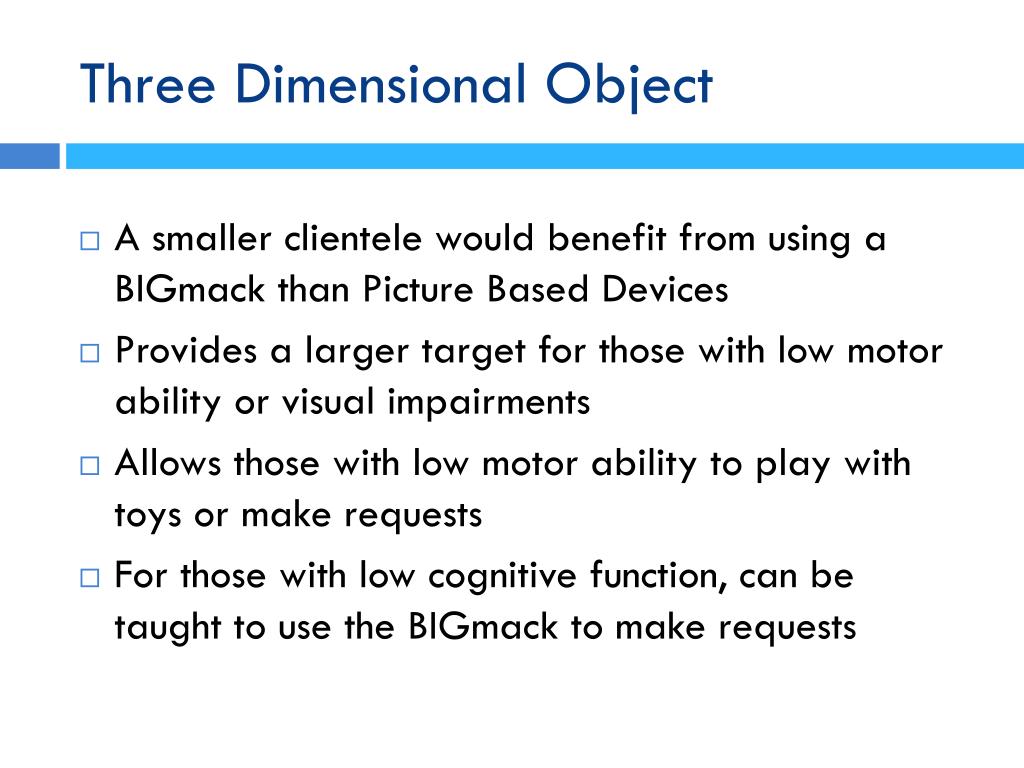 Three Dimensional Object • A smaller clientele would benefit from using a BIGmack than Picture Based Devices • Provides a larger target for those with low motor ability or visual impairments • Allows those with low motor ability to play with toys or make requests • For those with low cognitive function, can be taught to use the BIGmack to make requests