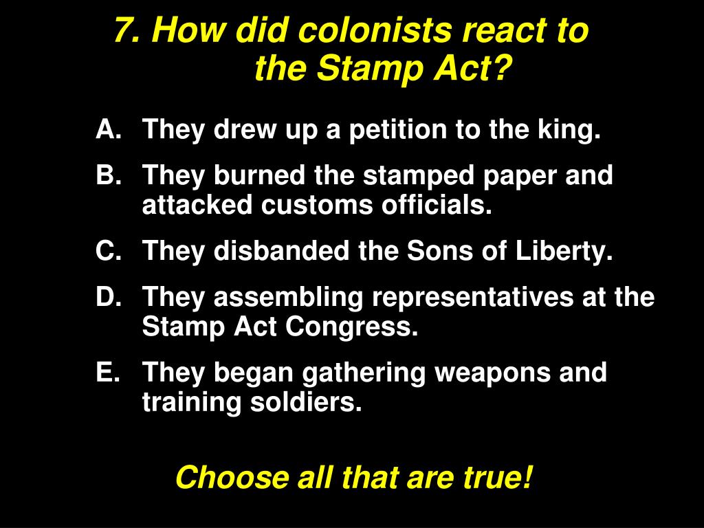 7. How did colonists react to the Stamp Act? • They drew up a petition to the king. • They burned the stamped paper and attacked customs officials. • They disbanded the Sons of Liberty. • They assembling representatives at the Stamp Act Congress. • They began gathering weapons and training soldiers. Choose all that are true!