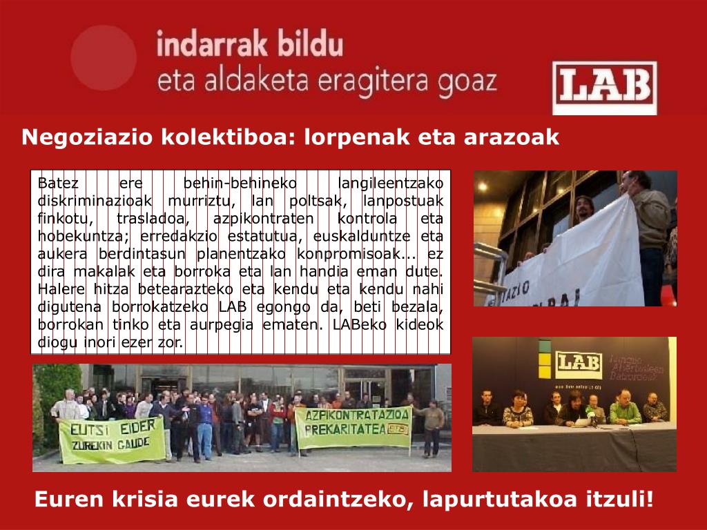 Negoziazio kolektiboa: lorpenak eta arazoak Batez ere behin-behineko langileentzako diskriminazioak murriztu, lan poltsak, lanpostuak finkotu, trasladoa, azpikontraten kontrola eta hobekuntza; erredakzio estatutua, euskalduntze eta aukera berdintasun planentzako konpromisoak... ez dira makalak eta borroka eta lan handia eman dute. Halere hitza betearazteko eta kendu eta kendu nahi digutena borrokatzeko LAB egongo da, beti bezala, borrokan tinko eta aurpegia ematen. LABeko kideok diogu inori ezer zor. Euren krisia eurek ordaintzeko, lapurtutakoa itzuli!