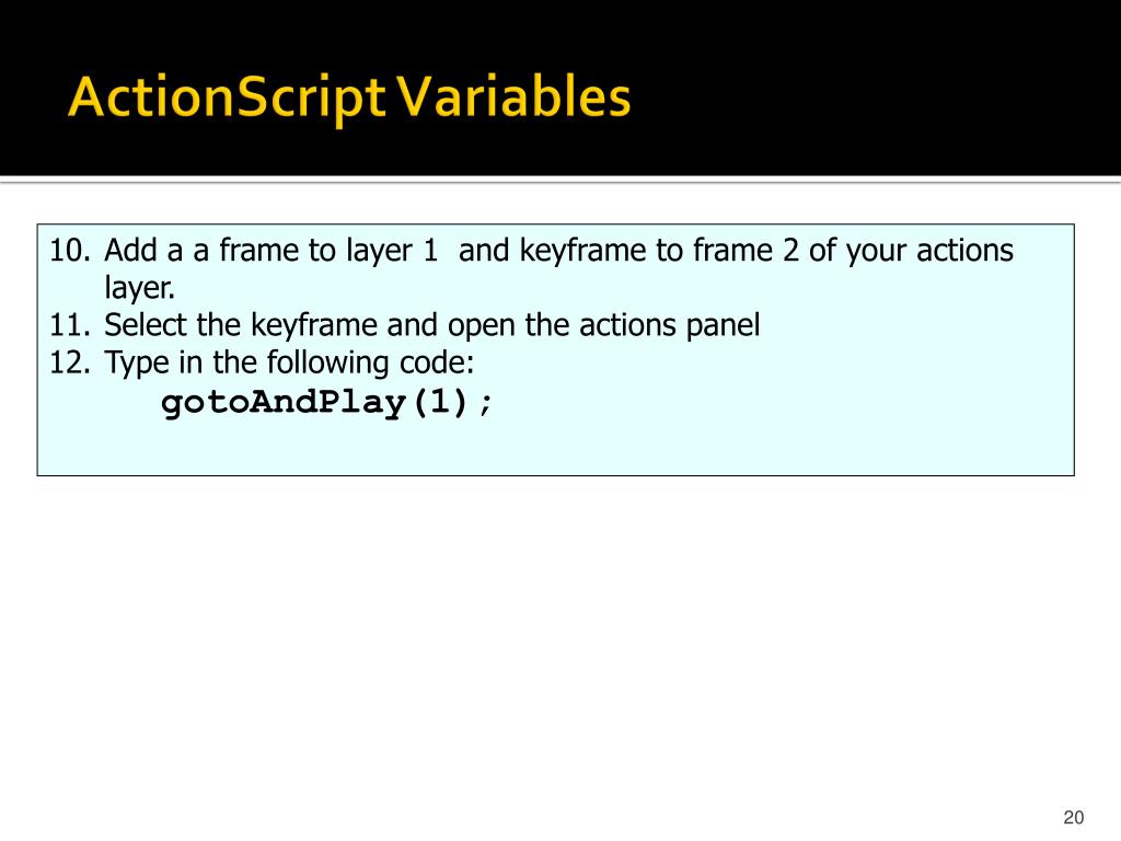 ActionScript Variables • Add a a frame to layer 1 and keyframe to frame 2 of your actions layer. • Select the keyframe and open the actions panel • Type in the following code: • gotoAndPlay(1);