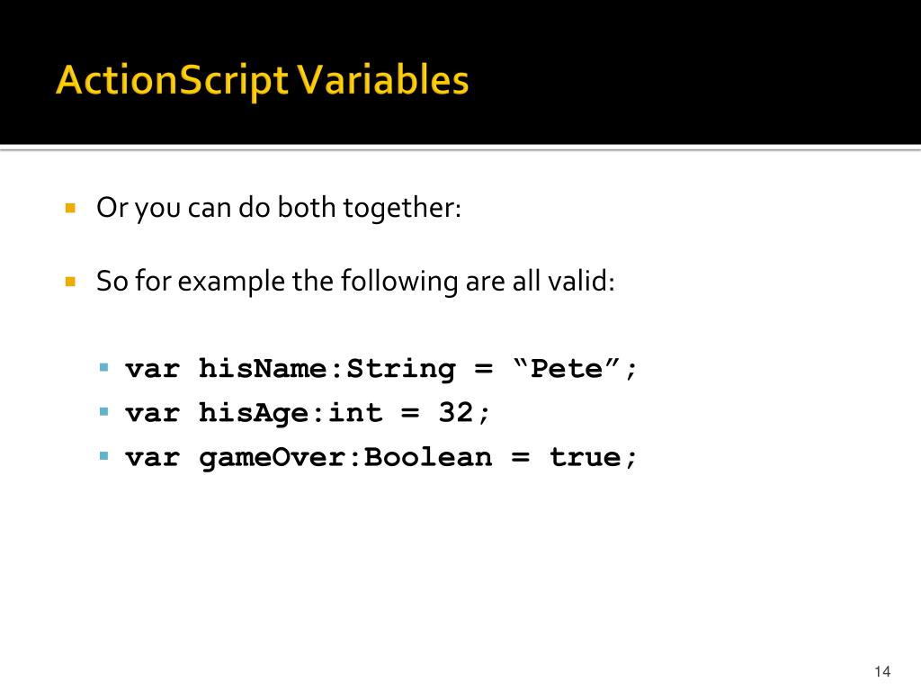 ActionScript Variables • Or you can do both together: • So for example the following are all valid: • var hisName:String = “Pete”; • var hisAge:int = 32; • var gameOver:Boolean = true;