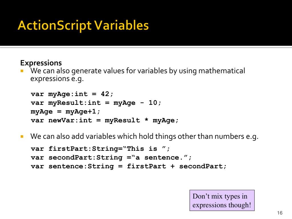 ActionScript Variables Expressions • We can also generate values for variables by using mathematical expressions e.g. varmyAge:int = 42; varmyResult:int = myAge - 10; myAge = myAge+1; varnewVar:int = myResult * myAge; • We can also add variables which hold things other than numbers e.g. varfirstPart:String=“This is ”; varsecondPart:String =“a sentence.”; varsentence:String = firstPart + secondPart; Don’t mix types in expressions though!