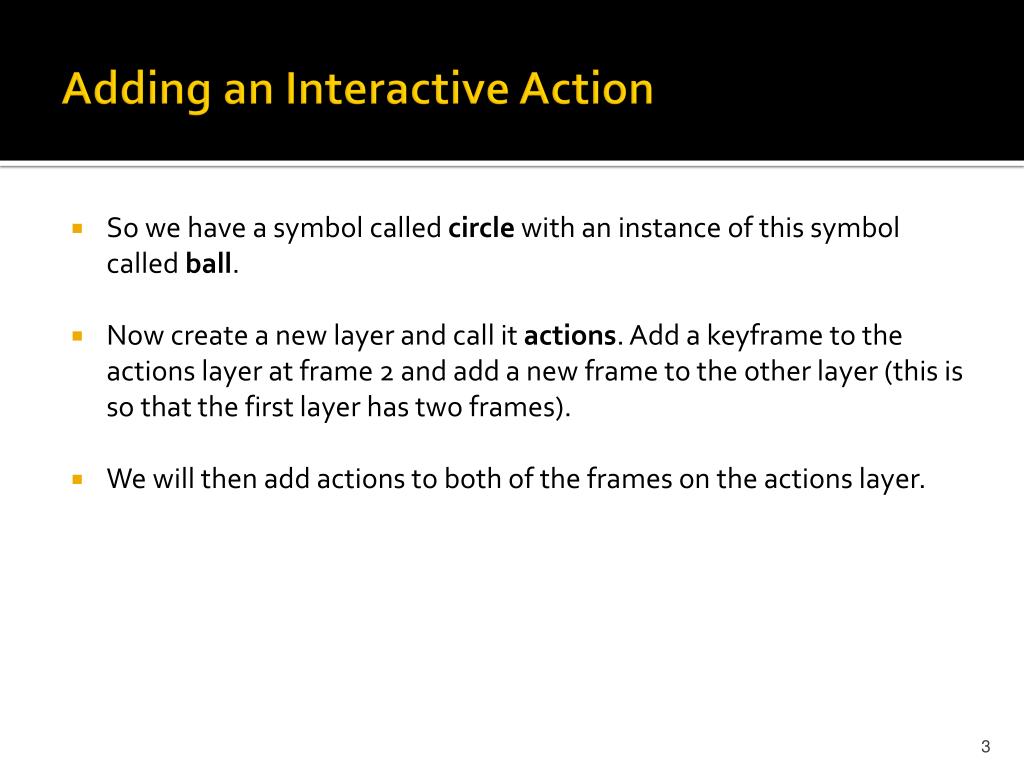 Adding an Interactive Action • So we have a symbol called circle with an instance of this symbol called ball. • Now create a new layer and call it actions. Add a keyframe to the actions layer at frame 2 and add a new frame to the other layer (this is so that the first layer has two frames). • We will then add actions to both of the frames on the actions layer.