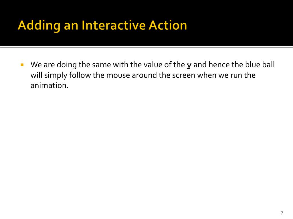 Adding an Interactive Action • We are doing the same with the value of the y and hence the blue ball will simply follow the mouse around the screen when we run the animation.