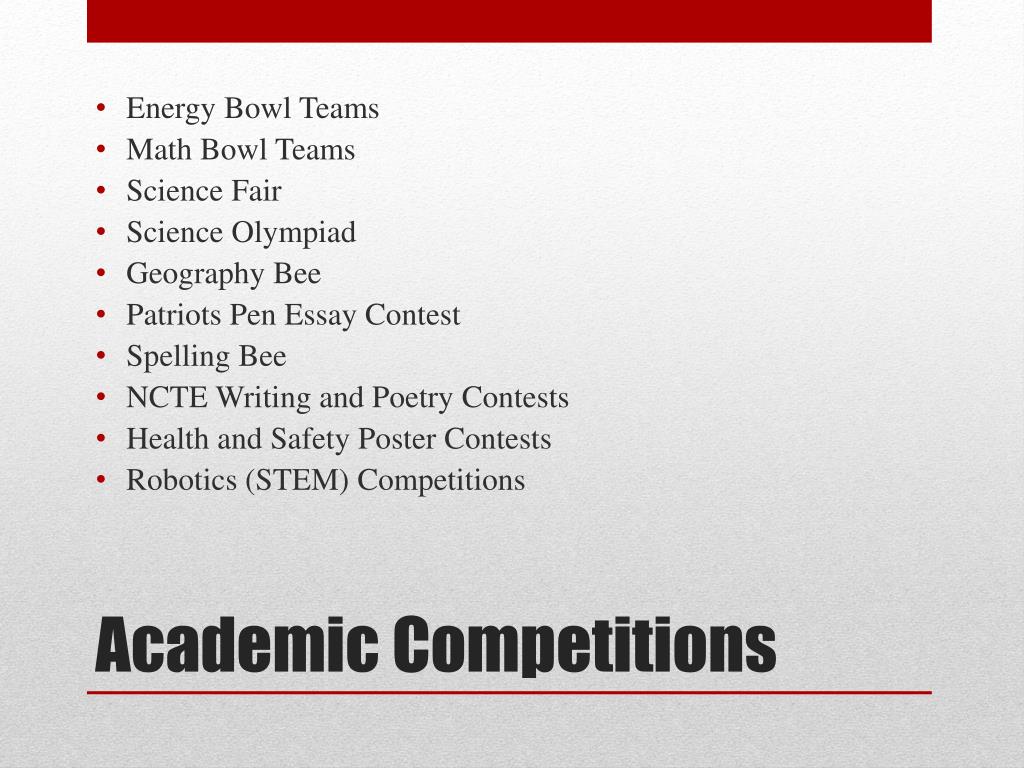 Energy Bowl Teams • Math Bowl Teams • Science Fair • Science Olympiad • Geography Bee • Patriots Pen Essay Contest • Spelling Bee • NCTE Writing and Poetry Contests • Health and Safety Poster Contests • Robotics (STEM) Competitions Academic Competitions