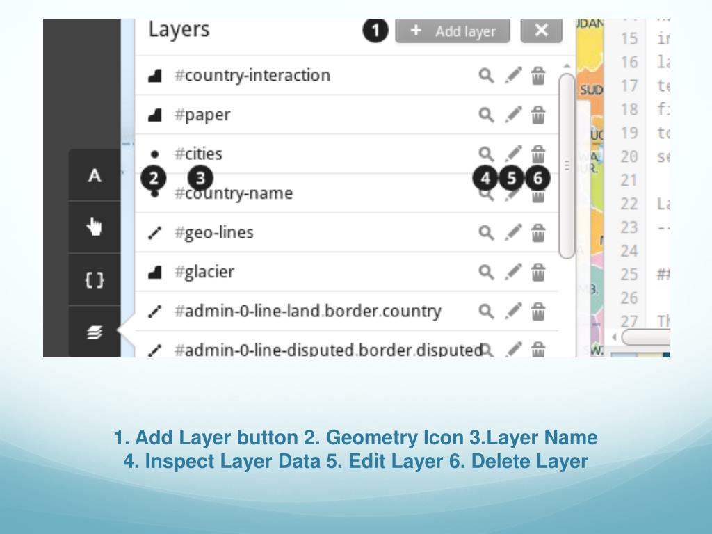 1. Add Layer button 2. Geometry Icon 3.Layer Name 4. Inspect Layer Data 5. Edit Layer 6. Delete Layer