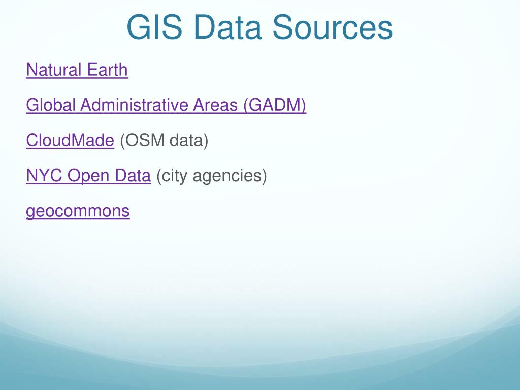 GIS Data Sources Natural Earth Global Administrative Areas (GADM) CloudMade (OSM data) NYC Open Data (cityagencies) geocommons