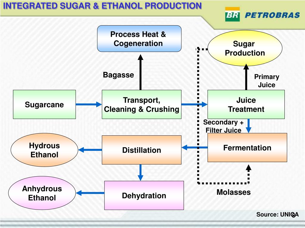 INTEGRATED SUGAR & ETHANOL PRODUCTION Process Heat & Cogeneration Sugar Production Bagasse Primary Juice Sugarcane Transport, Cleaning & Crushing Juice Treatment Secondary + Filter Juice Hydrous Ethanol Fermentation Distillation Anhydrous Ethanol Dehydration Molasses Source: UNICA