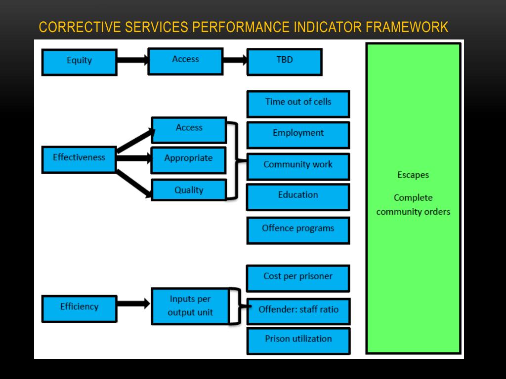 Balancing Efficiency & Effectiveness • If you don’t define what performance is, then someone else will define it for you. • Case in point: Lets look at the Performance Measures for Australian Corrections included in the recent review: Government Services 2013 • In Australia, corrections performance is monitored across the eight Australian States/territories in the following areas: • Efficiency, Equity, Outputs, and Outcomes • Utilizing these data elements, an overall performance ranking of each Australian state/territory’s corrections system is possible.