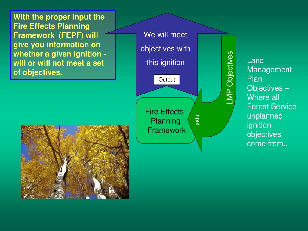 We will meet objectives with this ignition Land Management Plan Objectives – Where all Forest Service unplanned ignition objectives come from.. LMP Objectives Output input With the proper input the Fire Effects Planning Framework (FEPF) will give you information on whether a given ignition - will or will not meet a set of objectives. Fire Effects Planning Framework