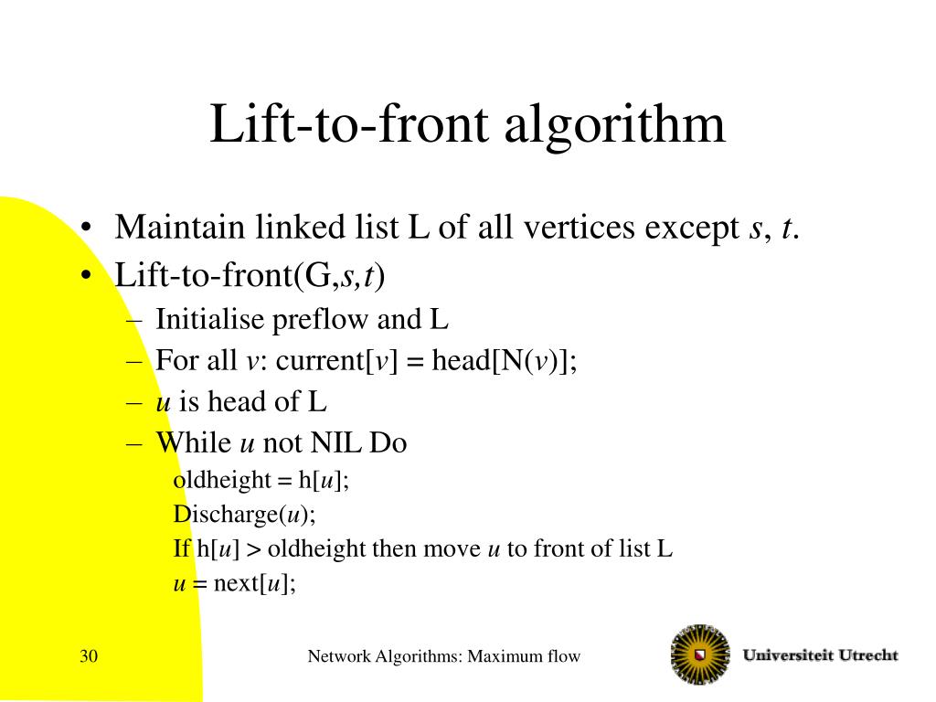 Lift-to-front algorithm • Maintain linked list L of all vertices except s, t. • Lift-to-front(G,s,t) • Initialise preflow and L • For all v: current[v] = head[N(v)]; • u is head of L • While u not NIL Do oldheight = h[u]; Discharge(u); If h[u] > oldheight then move u to front of list L u = next[u]; Network Algorithms: Maximum flow