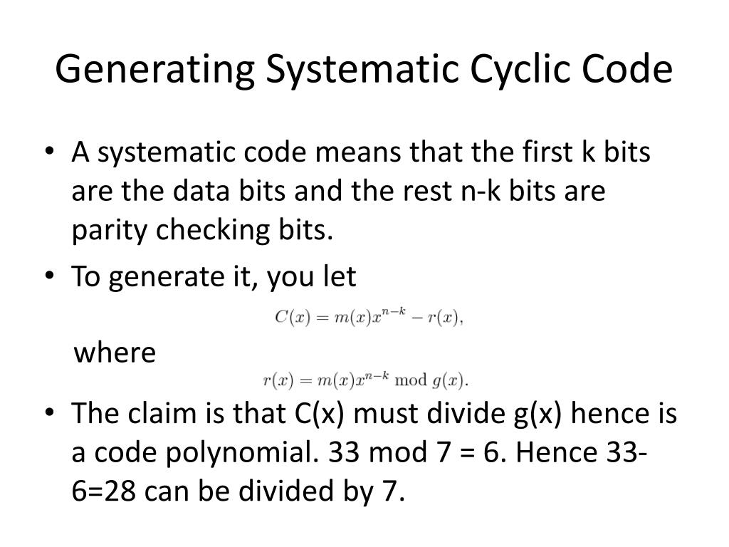 Generating Systematic Cyclic Code • A systematic code means that the first k bits are the data bits and the rest n-k bits are parity checking bits. • To generate it, you let where • The claim is that C(x) must divide g(x) hence is a code polynomial. 33 mod 7 = 6. Hence 33-6=28 can be divided by 7.