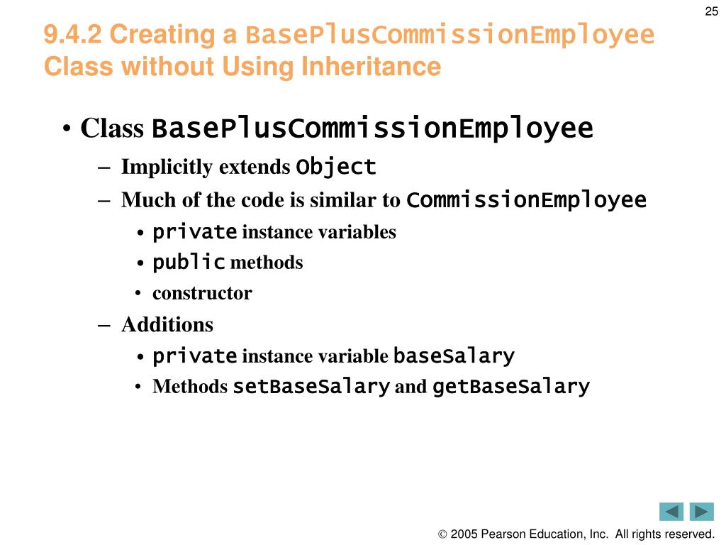 9.4.2 Creating a BasePlusCommissionEmployee Class without Using Inheritance • Class BasePlusCommissionEmployee • Implicitly extends Object • Much of the code is similar to CommissionEmployee • private instance variables • public methods • constructor • Additions • private instance variable baseSalary • Methods setBaseSalary and getBaseSalary