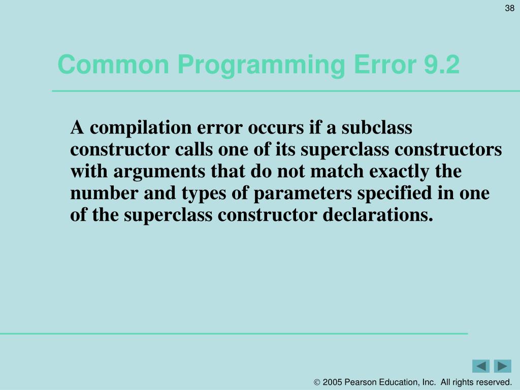Common Programming Error 9.2 • A compilation error occurs if a subclass constructor calls one of its superclass constructors with arguments that do not match exactly the number and types of parameters specified in one of the superclass constructor declarations.