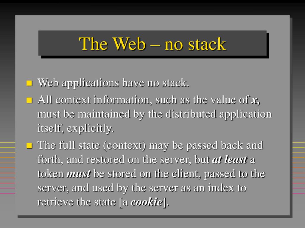 The Web – no stack • Web applications have no stack. • All context information, such as the value of x, must be maintained by the distributed application itself, explicitly. • The full state (context) may be passed back and forth, and restored on the server, but at leasta token must be stored on the client, passed to the server, and used by the server as an index to retrieve the state [a cookie].