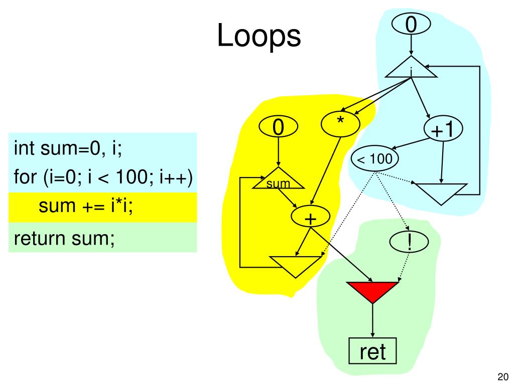 0 i * 0 +1 < 100 sum + return sum; ! ret Loops int sum=0, i; for (i=0; i < 100; i++) sum += i*i; return sum;