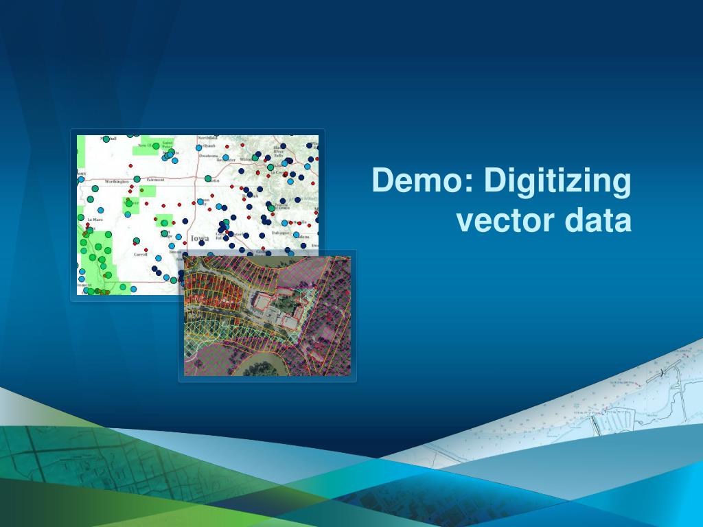 Summary: Digitizing vector data If necessary, create a shapefile or geodatabase feature class If necessary, add it to the map Start an edit session Choose feature template & construction tool Create new feature Add or edit attributes Save edits