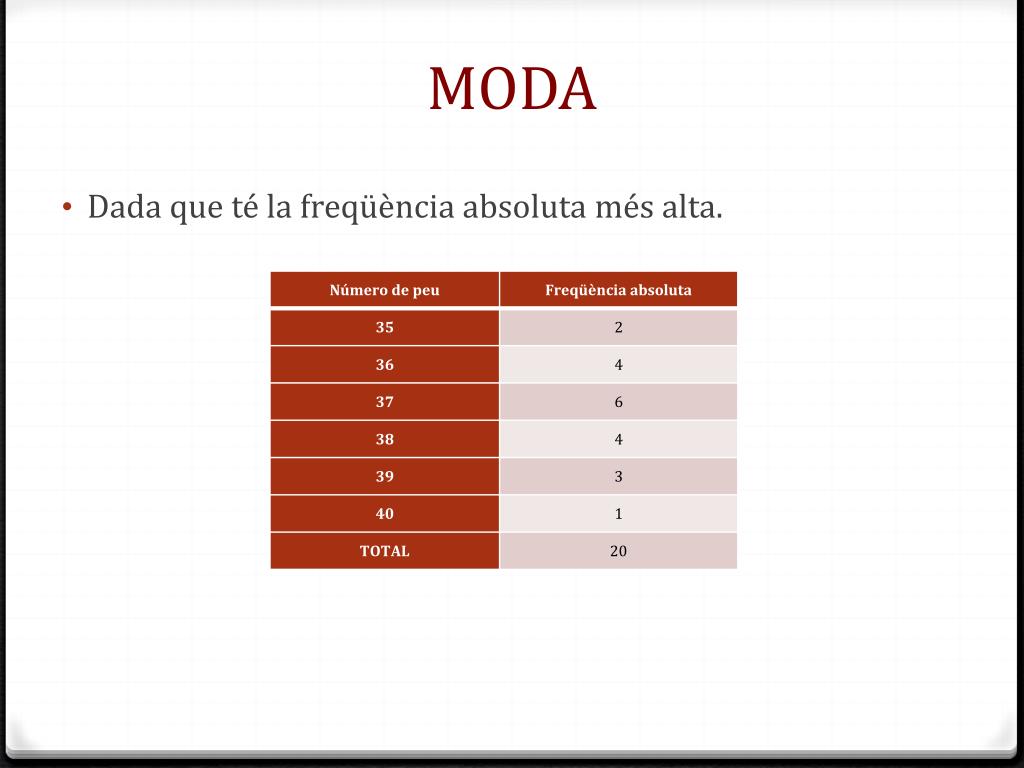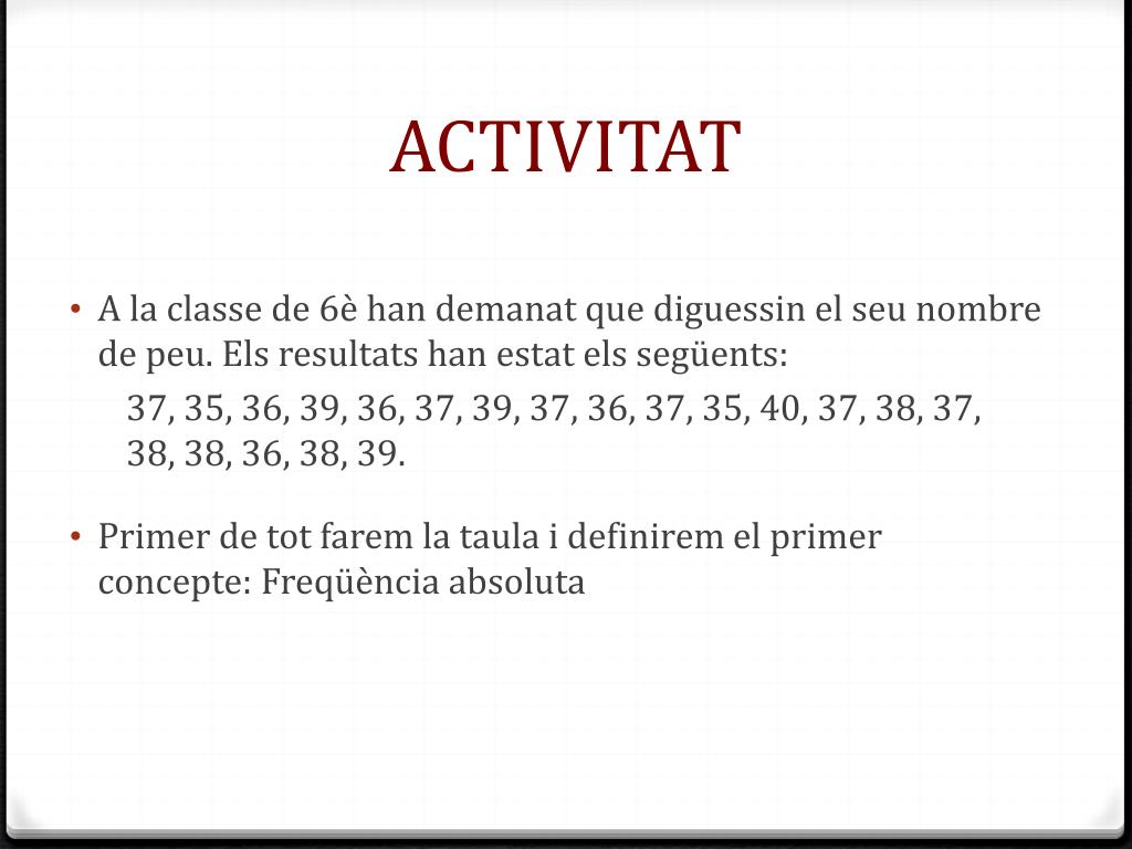 ACTIVITAT • A la classe de 6è han demanat que diguessin el seu nombre de peu. Els resultats han estat els següents: 37, 35, 36, 39, 36, 37, 39, 37, 36, 37, 35, 40, 37, 38, 37, 38, 38, 36, 38, 39. • Primer de tot farem la taula i definirem el primer concepte: Freqüència absoluta