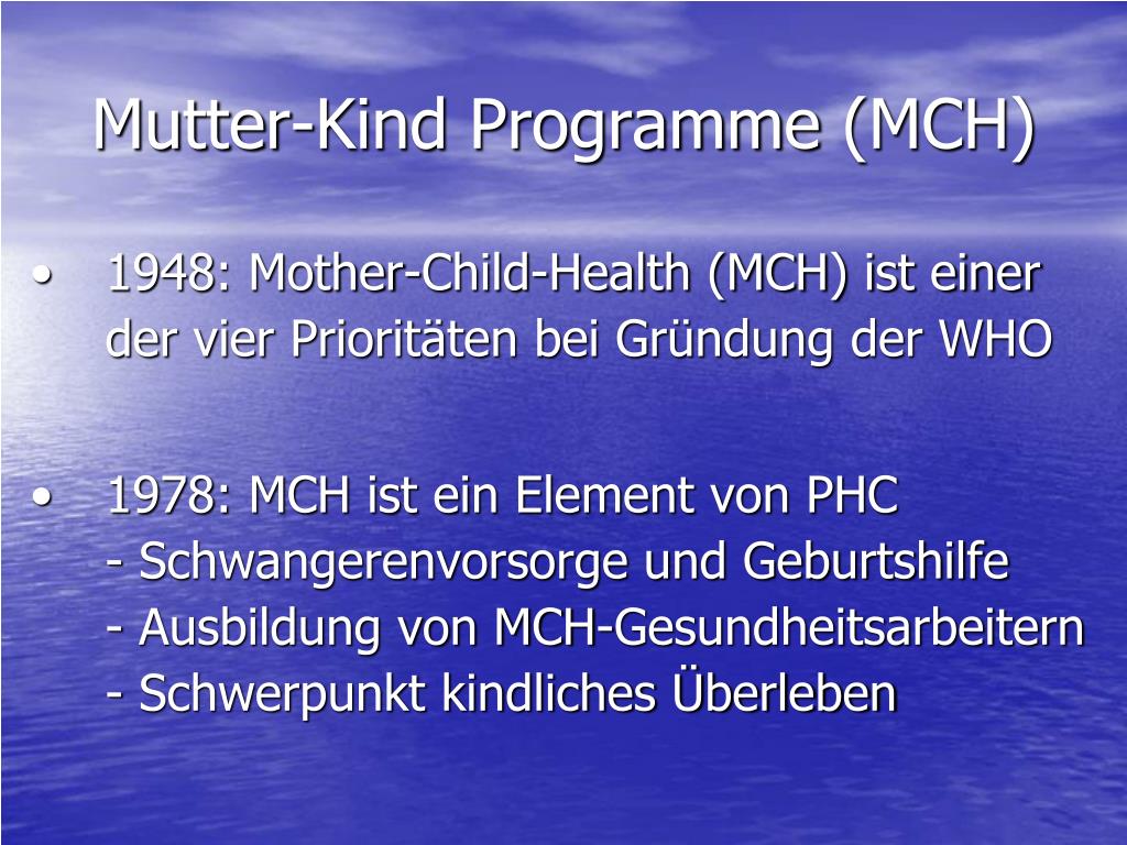 Mutter-Kind Programme (MCH) • 1948: Mother-Child-Health (MCH) ist einer der vier Prioritäten bei Gründung der WHO • 1978: MCH ist ein Element von PHC- Schwangerenvorsorge und Geburtshilfe- Ausbildung von MCH-Gesundheitsarbeitern- Schwerpunkt kindliches Überleben