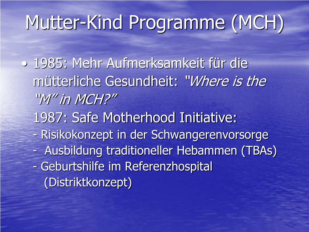 Mutter-Kind Programme (MCH) • 1985: Mehr Aufmerksamkeit für die mütterliche Gesundheit: “Where is the “M” in MCH?”1987: Safe Motherhood Initiative:- Risikokonzept in der Schwangerenvorsorge- Ausbildung traditioneller Hebammen (TBAs)- Geburtshilfe im Referenzhospital (Distriktkonzept)