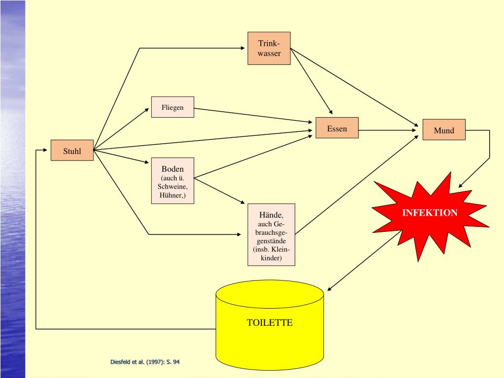 Toilettensysteme: Primärprävention • Keine Toilette • Straßenrand, Busch, Wasserkanäle, Reisfelder… • Trockenlatrine • Grube mit Abdeckplatte, Gefahr der Gasbildung, Fliegenbrutstelle • Belüftete Trockenlatrine • Grube wird entlüftet, Fliegenfalle • Spültoilette mit Geruchsverschluss • Geringer Wasserverbrauch, dient primär über Siphon der Geruchsreduktion • Wasserklosett • Vollständige Entfernung der Exkremente mit Hilfe von Wasserdruck und -menge Medizin und Wasser