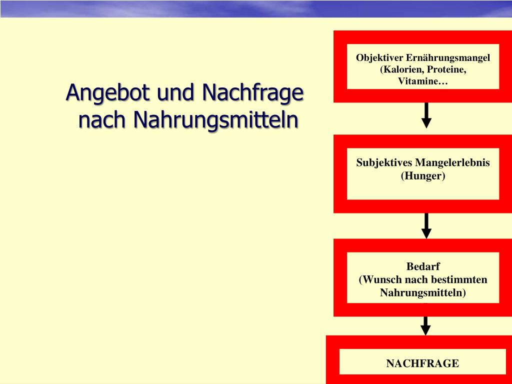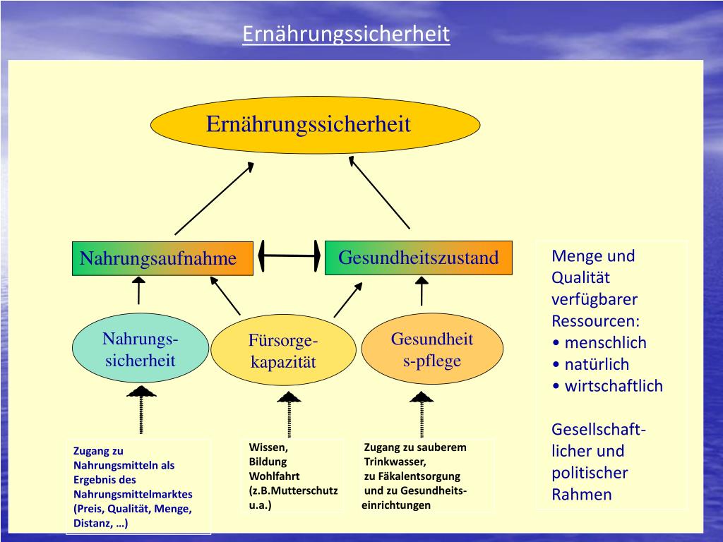 Ernährungssicherheit Ernährungssicherheit Gesundheitszustand • Menge und Qualität verfügbarer Ressourcen: • menschlich • natürlich • wirtschaftlich • Gesellschaft-licher und politischer • Rahmen Nahrungsaufnahme Nahrungs- sicherheit Gesundheits-pflege Fürsorge-kapazität Zugang zu Nahrungsmitteln als Ergebnis des Nahrungsmittelmarktes (Preis, Qualität, Menge, Distanz, …) Wissen, Bildung Wohlfahrt (z.B.Mutterschutz u.a.) Zugang zu sauberem Trinkwasser, zu Fäkalentsorgung und zu Gesundheits-einrichtungen