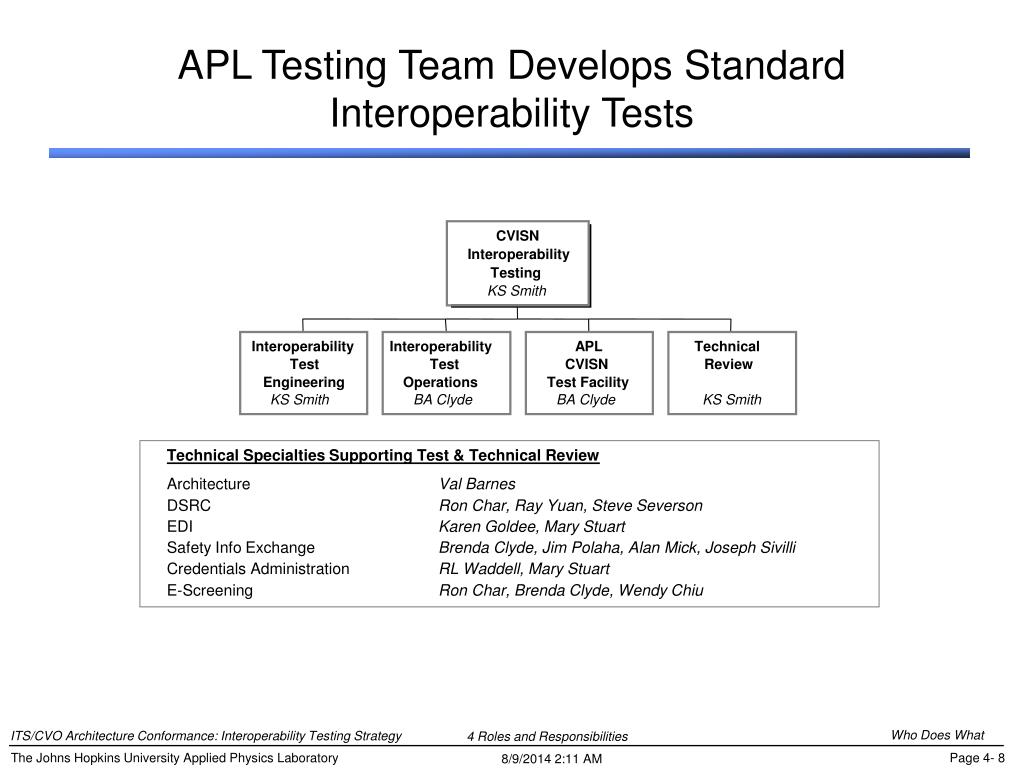 APL Testing Team Develops Standard Interoperability Tests CVISN Interoperability Testing KS Smith Interoperability Interoperability APL Technical Test Test CVISN Review Engineering Operations Test Facility KS Smith BA Clyde BA Clyde KS Smith Technical Specialties Supporting Test & Technical Review Architecture Val Barnes DSRC Ron Char, Ray Yuan, Steve Severson EDI Karen Goldee, Mary Stuart Safety Info Exchange Brenda Clyde, Jim Polaha, Alan Mick, Joseph Sivilli Credentials Administration RL Waddell, Mary Stuart E-Screening Ron Char, Brenda Clyde, Wendy Chiu Who Does What The Johns Hopkins University Applied Physics Laboratory