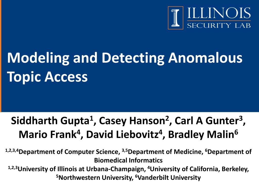 Modeling and Detecting Anomalous Topic Access Siddharth Gupta1, Casey Hanson2, Carl A Gunter3, Mario Frank4, David Liebovitz4, Bradley Malin6 1,2,3,4Department of Computer Science, 3,5Department of Medicine, 6Department of Biomedical Informatics1,2,3University of Illinois at Urbana-Champaign, 4University of California, Berkeley, 5Northwestern University, 6Vanderbilt University