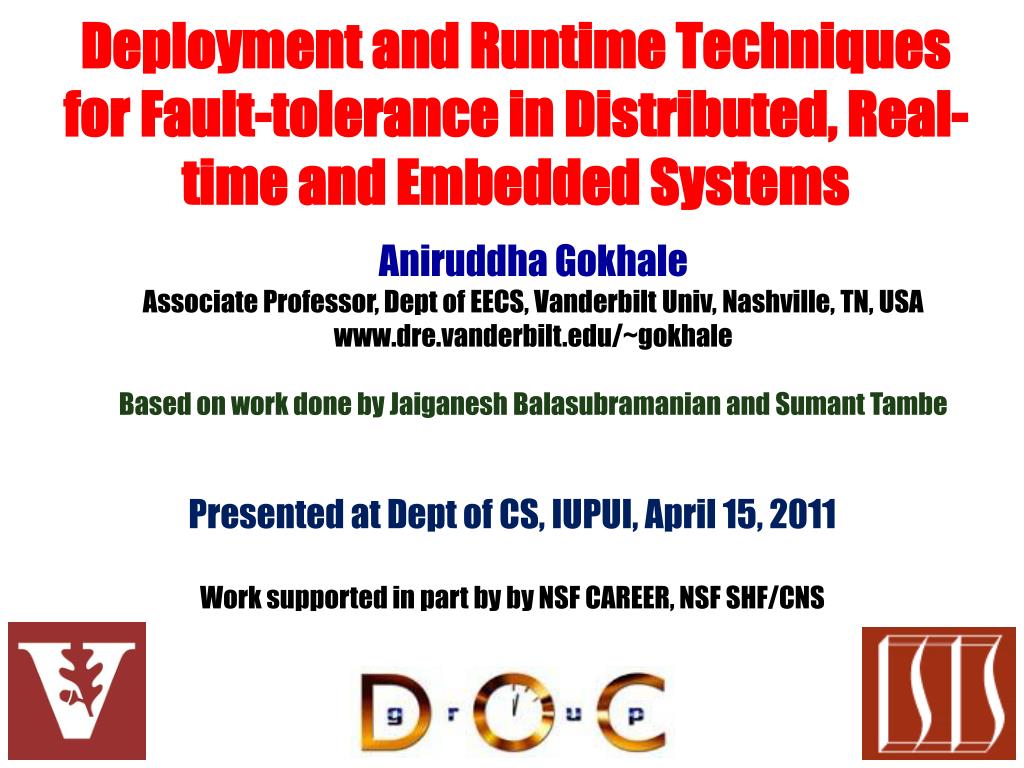 Aniruddha Gokhale Associate Professor, Dept of EECS, Vanderbilt Univ, Nashville, TN, USA www.dre.vanderbilt.edu/~gokhale Based on work done by JaiganeshBalasubramanian and SumantTambe Deployment and Runtime Techniques for Fault-tolerance in Distributed, Real-time and Embedded Systems Presented at Dept of CS, IUPUI, April 15, 2011 Work supported in part by by NSF CAREER, NSF SHF/CNS