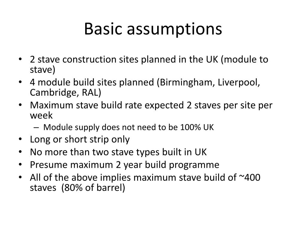 UK production plans. Ian Wilmut. Basic assumptions. 2 stave construction sites planned in the UK (module to stave) 4 module build sites planned (Birmingham, Liverpool, Cambridge, RAL) Maximum stave build rate expected 2 staves per site per week Module supply does not need to be 100% UK