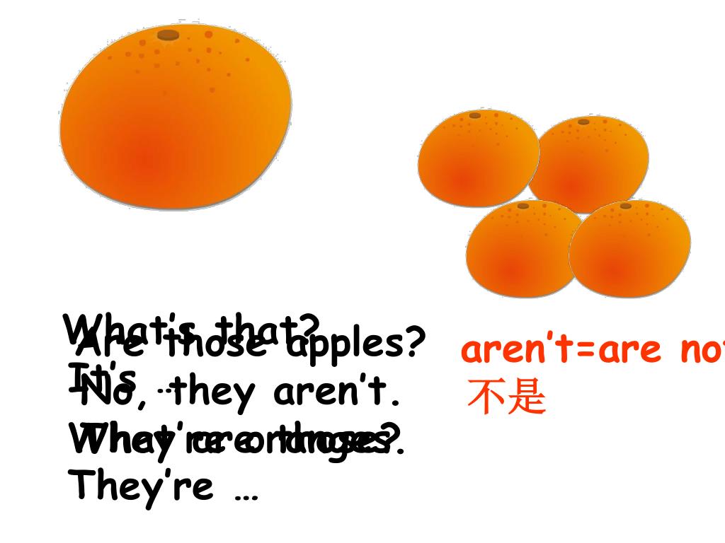 What’s that? Are those apples? aren’t=are not It’s … No, they aren’t. They’re oranges. 不是 What are those? They’re …