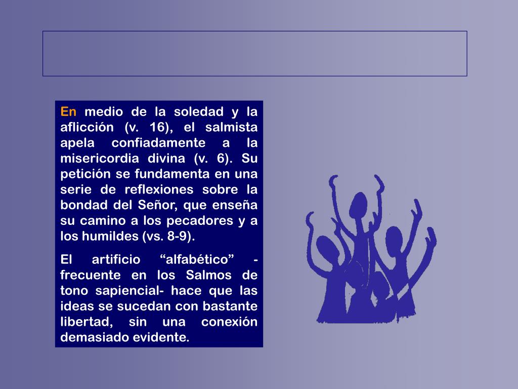 En medio de la soledad y la aflicción (v. 16), el salmista apela confiadamente a la misericordia divina (v. 6). Su petición se fundamenta en una serie de reflexiones sobre la bondad del Señor, que enseña su camino a los pecadores y a los humildes (vs. 8-9). El artificio “alfabético” -frecuente en los Salmos de tono sapiencial- hace que las ideas se sucedan con bastante libertad, sin una conexión demasiado evidente.
