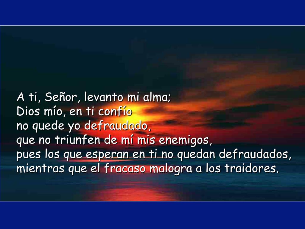 A ti, Señor, levanto mi alma;Dios mío, en ti confíono quede yo defraudado,que no triunfen de mí mis enemigos,pues los que esperan en ti no quedan defraudados,mientras que el fracaso malogra a los traidores.