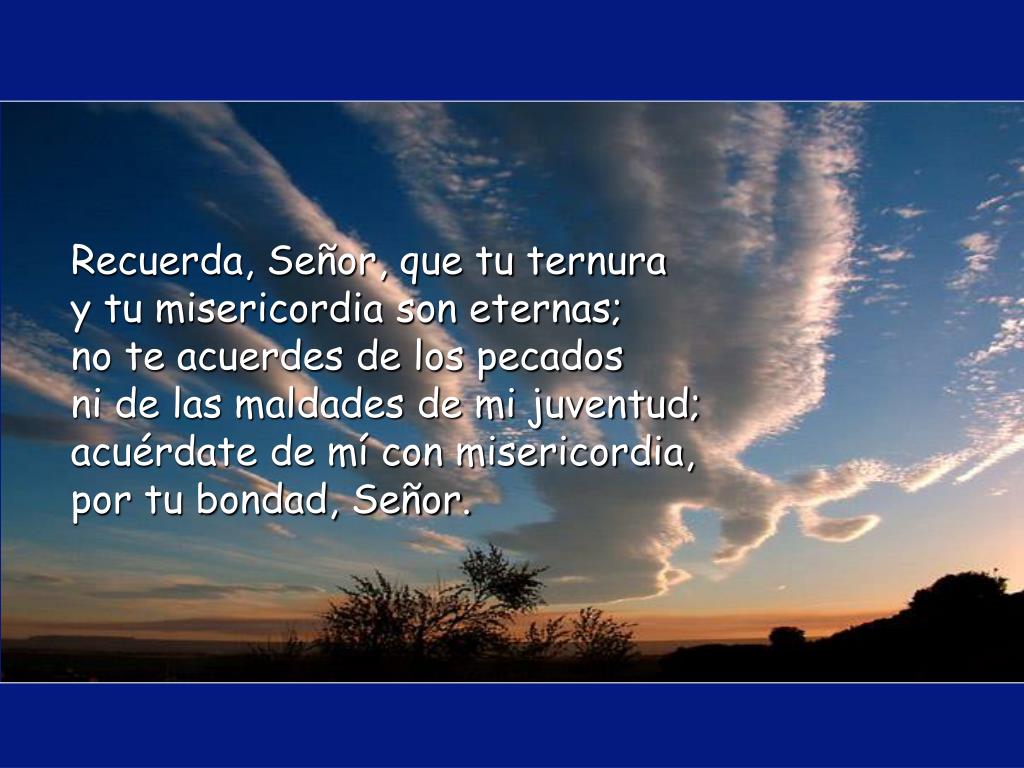 Recuerda, Señor, que tu ternuray tu misericordia son eternas;no te acuerdes de los pecadosni de las maldades de mi juventud;acuérdate de mí con misericordia,por tu bondad, Señor.
