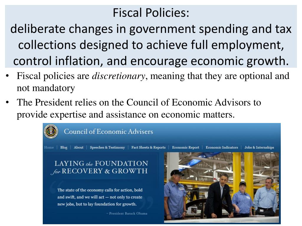 Fiscal Policies:deliberate changes in government spending and tax collections designed to achieve full employment, control inflation, and encourage economic growth. • Fiscal policies are discretionary, meaning that they are optional and not mandatory • The President relies on the Council of Economic Advisors to provide expertise and assistance on economic matters.
