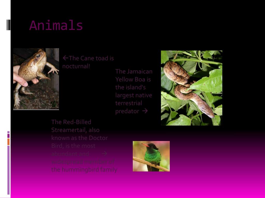 By: Schneider & Schlough. Jamaica!. Animals. The Cane toad is nocturnal!. The Jamaican Yellow Boa is the island's largest native terrestrial predator .