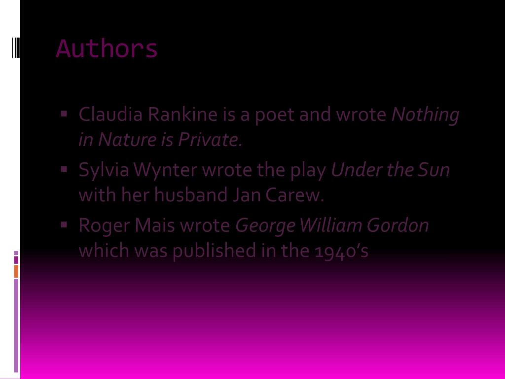 Authors • Claudia Rankine is a poet and wrote Nothing in Nature is Private. • Sylvia Wynter wrote the play Under the Sun with her husband Jan Carew. • Roger Mais wrote George William Gordon which was published in the 1940’s