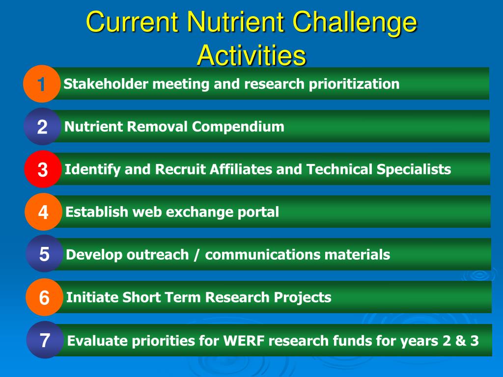 Current Nutrient Challenge Activities 1 Stakeholdermeeting and research prioritization 2 Nutrient Removal Compendium 3 Identify and Recruit Affiliates and Technical Specialists 4 Establish web exchange portal 5 Develop outreach / communications materials 6 Initiate Short Term Research Projects 7 Evaluate priorities for WERF research funds for years 2 & 3