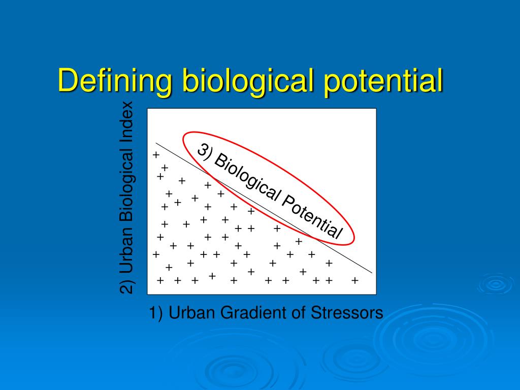 Bioassessment: A Tool for Managing Urban Aquatic Life Uses • Michael Barbour and team, Tetra Tech • Examines how biocriteria and biological assessment can be used to evaluate water quality on a watershed scale and to evaluate aquatic life use designations. • Evaluates the degree to which urban systems can be assessed using predictive relationships between relative gradients of urbanization and biological conditions.