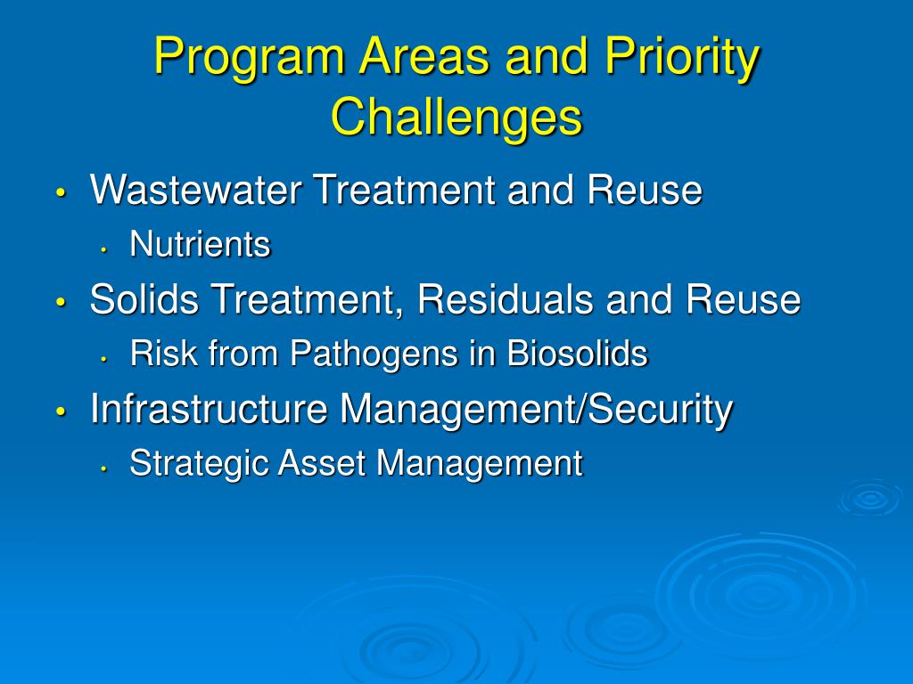 Program Areas and Priority Challenges • Wastewater Treatment and Reuse • Nutrients • Solids Treatment, Residuals and Reuse • Risk from Pathogens in Biosolids • Infrastructure Management/Security • Strategic Asset Management