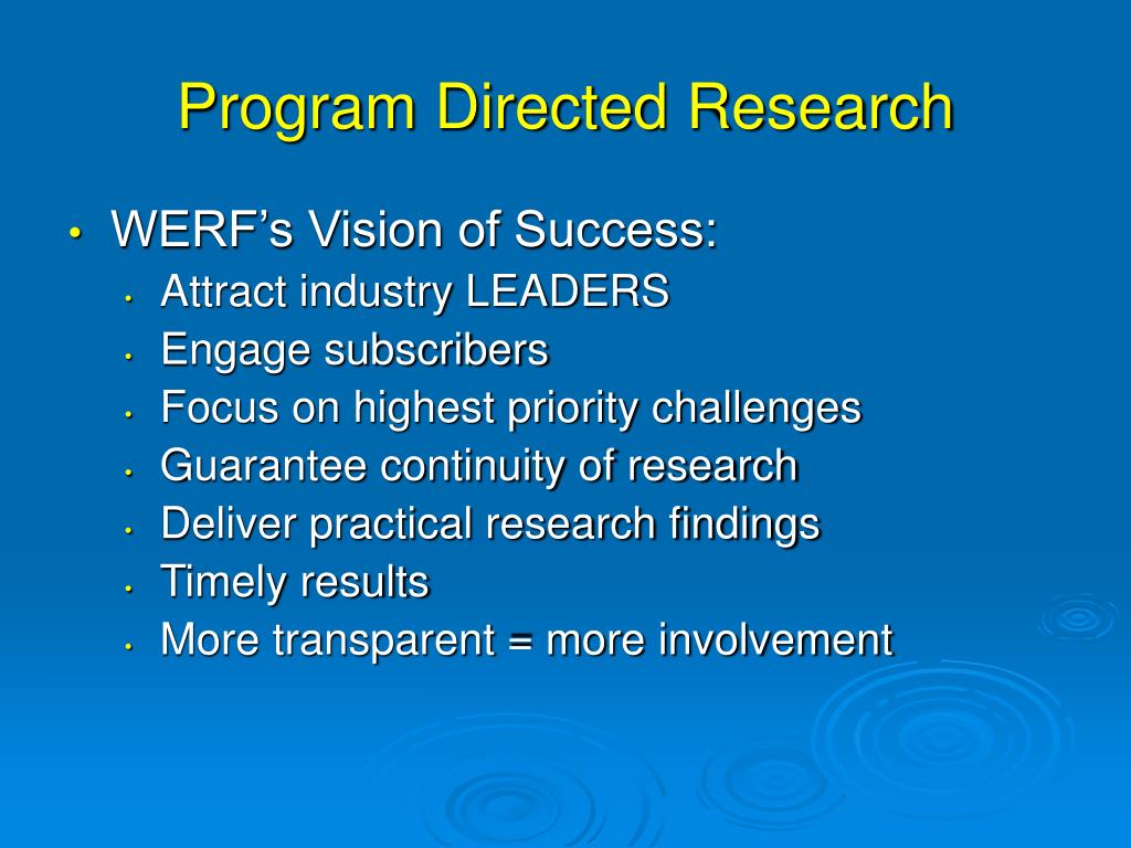 Program Directed Research • WERF’s Vision of Success: • Attract industry LEADERS • Engage subscribers • Focus on highest priority challenges • Guarantee continuity of research • Deliver practical research findings • Timely results • More transparent = more involvement