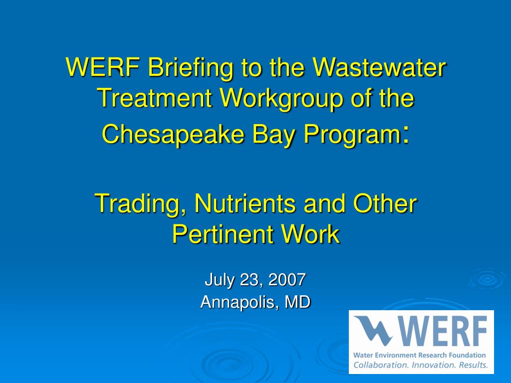 WERF Briefing to the Wastewater Treatment Workgroup of the Chesapeake Bay Program:Trading, Nutrients and Other Pertinent Work July 23, 2007 Annapolis, MD